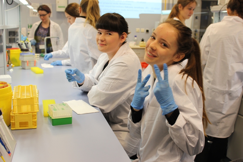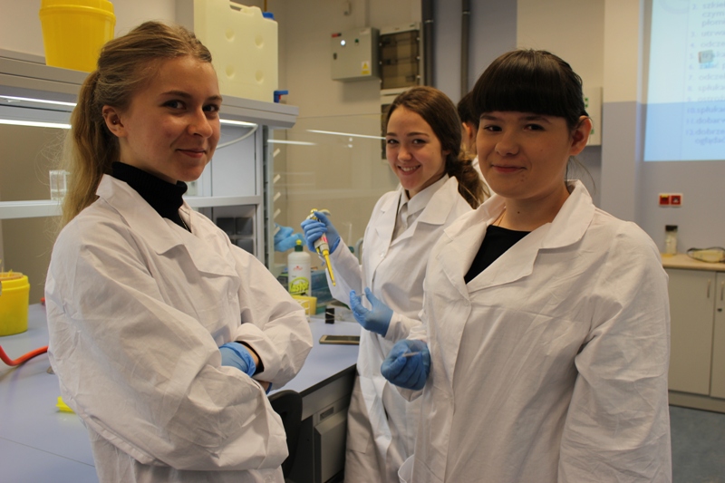 Na początku zajęć dowiedzieliśmy się jak krok po kroku przebiega barwienie bakterii metodą Gramma. Poznaliśmy jak pozyskać plazmidowe DNA bakterii, jak wygląda analiza restrykcyjna DNA oraz jak przeprowadzić elektroforezę na żelu agarozowym. Z teorii szybko przeszliśmy do praktyki. Gdy zapoznaliśmy się już ze sprzętem laboratoryjnym, mogliśmy wziąć się do pracy. Pracując w parach, zaczęliśmy od barwienia bakterii. Udało nam się pozyskać piękne preparaty, które później oglądaliśmy pod mikroskopem. Następnie przystąpiliśmy do pozyskania DNA plazmidowego z bakterii Escherichia coli. Gdy wszystkie próbki były gotowe, mogliśmy przejść do elektoforezy. Gdy pozyskane z bakterii DNA umieściliśmy na żelu agarozowym pozwoliliśmy sobie na krótką przerwę. Gdy wróciliśmy do sali laboratoryjnej, wyniki były gotowe. Analiza udała się całej grupie! Na sam koniec zajęć wykonaliśmy pamiątkową fotografię z prowadzącymi. Podczas zajęć trwających trzy godziny pozyskaliśmy wiele cennej wiedzy oraz umiejętności, które z pewnością przydadzą nam się w dalszej nauce.