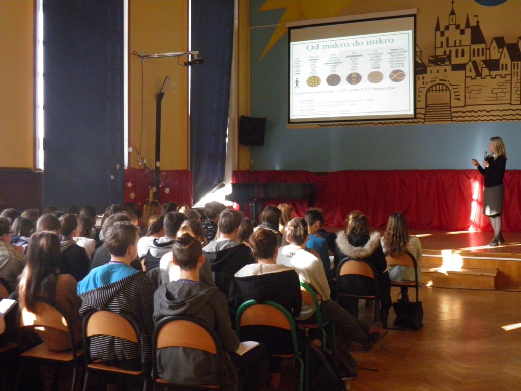 Pierwsze zajęcia (zatytułowane: "Co nam "siedzi" w genach") poprowadziła Pani dr Ewa Piotrowska z Katedry Biologii Molekularnej. W czasie wykładu prowadząca omówiła sposoby przekazywania informacji genetycznej, chromosomową teorię dziedziczenia, choroby genetyczne oraz techniki cytogenetycznych. Dowiedzieliśmy się, że zdrowie to rodzaj układanki, na którą, poza genomem składają się jeszcze styl życia i czynniki środowiskowe.
