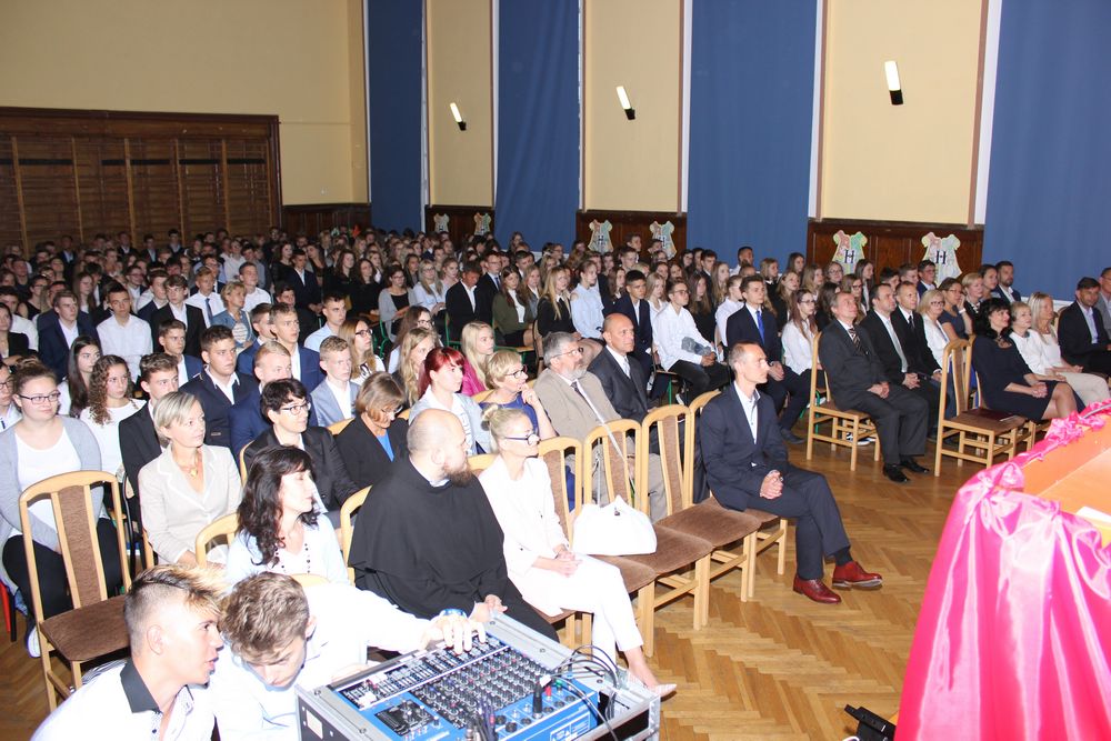 Po chwilach radości i beztroski nadszedł czas na część oficjalną. Nie zabrakło sztandaru, hymnu, przemówień i chociaż to rozpoczęcie roku, również pożegnań. W nowy rok szkolny wprowadziła nas nowa Pani Dyrektor Katarzyna Wach. Bardzo serdecznie powitała uczniów klas pierwszych, życząc im wielu sukcesów na ponadgimnazjalnym etapie nauczania. Młodzież miała okazję poznać swoich wychowawców i nauczycieli poszczególnych przedmiotów. Ponadto równie ciepło zostali powitani uczniowie klas starszych i nauczyciele. Tradycją szkoły jest, by w tym dniu nawiązywać do wydarzeń, jakie rozegrały się w naszym kraju 1 września 1939 roku. A zatem uczennice klasy IIB zaśpiewały piosenki o tematyce wojennej.