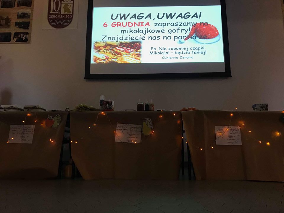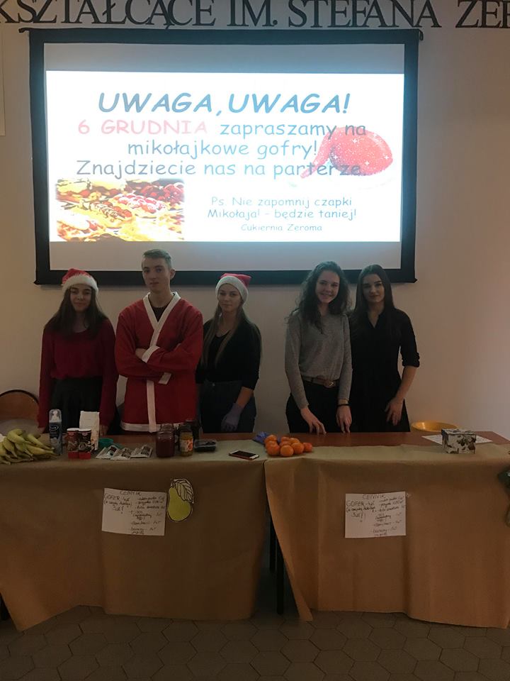 W ramach projektu zwolnieni z teorii Dnia 6.12.2018 "Cukiernia Żeroma" zorganizowała sprzedaż mikołajkowych gofrów. Do wyboru były różne dodatki m.in. Konfitury domowej roboty, polewy, bita śmietana, musy. Każdy znalazł coś dla siebie. Nasza akcja cieszyła się dużym zainteresowaniem wśród uczniów i nauczycieli. Zapraszamy za miesiąc!