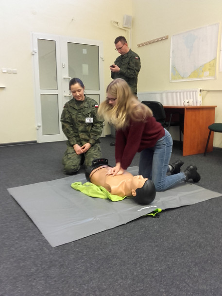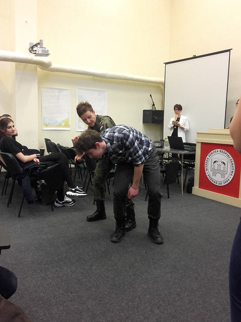 Na wstępie zapoznano nas ze sposobem rekrutacji na uczelnię i do Wojsk Obrony Terytorialnej, zwanych terytorialsami i jaka z tym wiąże się przyszła kariera. Po krótkim wykładzie, przystąpiliśmy do zajęć praktycznych z zakresu samoobrony i pierwszej pomocy. 2.5 godzinny pobyt szybko upłynął.