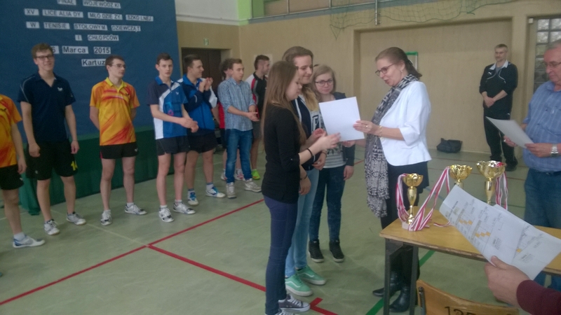 W czwartek 26 marca tego roku uczniowie naszej szkoły wyśmienicie zaprezentowali się na finałach wojewódzkich Licealiady w tenisie stołowym, które odbyły się w Kartuzach. Spośród pięciu najlepszych drużyn w województwie wyłonionych w półfinałach wojewódzkich poszczególnych okręgów, nasi tenisiści w składzie: Adam Dosz, Sławomir Dosz i Filip Dyszerzdobyli I miejsce.