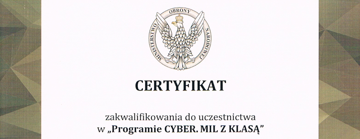 3. lipca 2020 r. dyrektor szkoły – dr Katarzyna Wach – odebrała z rąk Ministra MON – Mariusza Błaszczaka – certyfikat kwalifikujące szkołę do uczestnictwa w „Programie CYBER.MIL Z KLASĄ”.