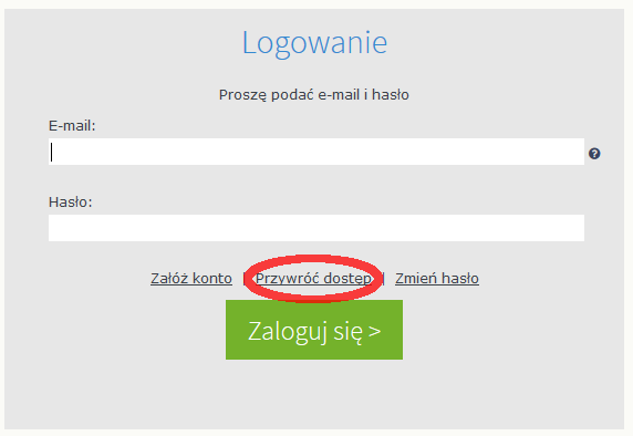 Przy pierwszym logowaniu (lub odzyskiwaniu hasła), wciskamy link "przywracanie dostępu", następnie wpisujemy swój adres e-mail i zaznaczamy opcję: "NIE JESTEM ROBOTEM".